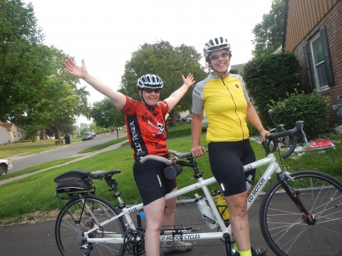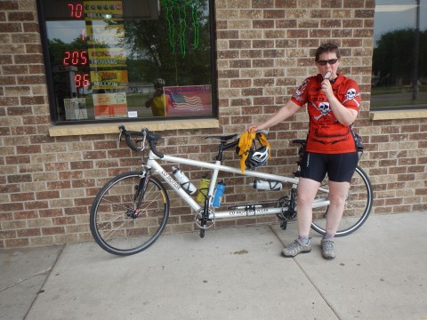 This year, she finally asked about going to the Iowa Populaire. It's only 79 miles and she had done the distance with more climbing. Yes, we hadn't had the tandem out since October (it was April), but she was undaunted. "I've been going to the gym and Zac beats me up". For the record, Zac also beats Road Pixie up - as much as a 400k beats her up only in 1 hour instead of 20.