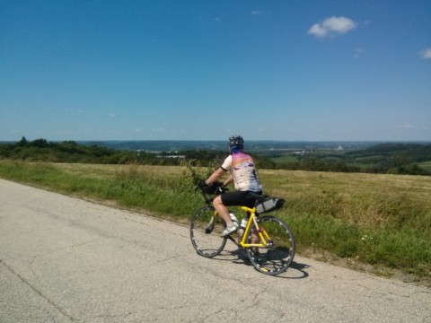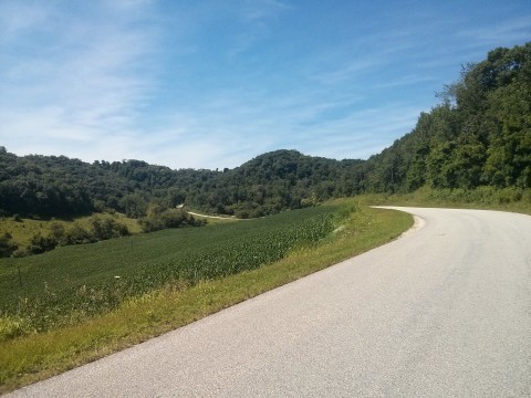 Platt Valley Road has several false summits and the combination with crumbling pavement is mentally tough. Last time I did it, I got to the top and about collapsed from an asthma attack. This time, I didn't have issues and I was ready for the false summits so they didn't surprise me so much. Dan was ahead, but they did manage to phase him a little and he was more winded at the top than perhaps usual. The rollers on top of the bluff were an additional challenge for recovery but we soon found ourselves whizzing down CTY Y to Fountain City and the turnaround.