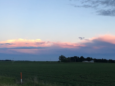 There was a northwest wind blowing which slowed me slightly but as I angled up to Scranton, it gave me an occasional push too. The Scranton Casey's is notorious for not having much in the way of food, but heck, there was some pizza. So I had yet another piece along with some lemonade - a 10 minute stop at 164 miles. From here, at 6:00 pm, the wind was at its peak from the west northwest and 90% of the rest of the ride was east or south. Yum.